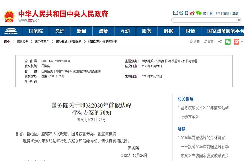 2021年10月24日,國務(wù)院發(fā)布《2030年前碳達(dá)峰行動(dòng)方案》(以下簡稱《方案》),原文指出:
