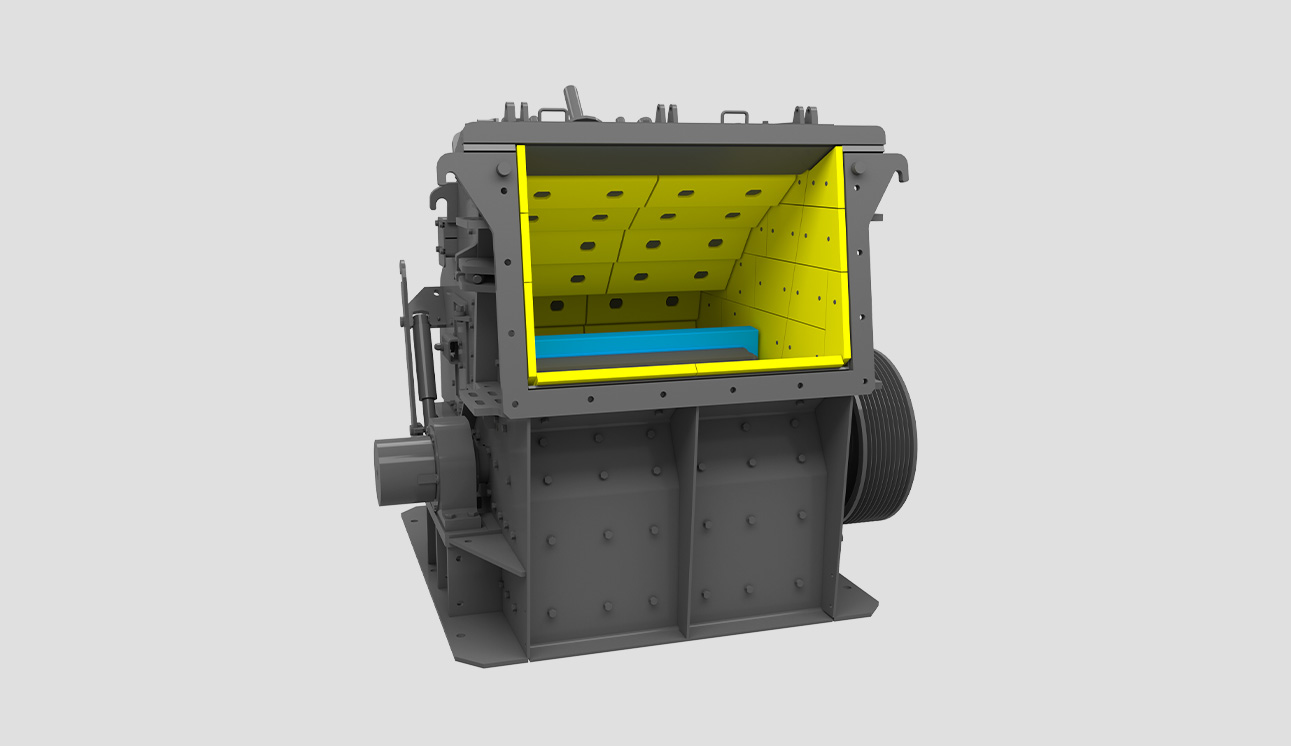 反擊式破碎機(jī)是一種利用沖擊能來(lái)破碎物料的破碎機(jī)械。本機(jī)工作時(shí),在電動(dòng)機(jī)的帶動(dòng)下轉(zhuǎn)子高速旋轉(zhuǎn),物料進(jìn)入板錘作用區(qū)時(shí),與轉(zhuǎn)子上的板錘撞擊破碎,后又被拋向反擊裝置上再次破碎,然后又從反擊襯板上彈回到板錘作用區(qū)重新破碎,此過(guò)程重復(fù)進(jìn)行,物料由大到小進(jìn)入一、二、三反擊腔重復(fù)進(jìn)行破碎,直到物料被破碎至所需粒度,由出料口排出調(diào)整反擊架與轉(zhuǎn)子之間的間隙可達(dá)到改變物料出料粒度和物料形狀的目的。
